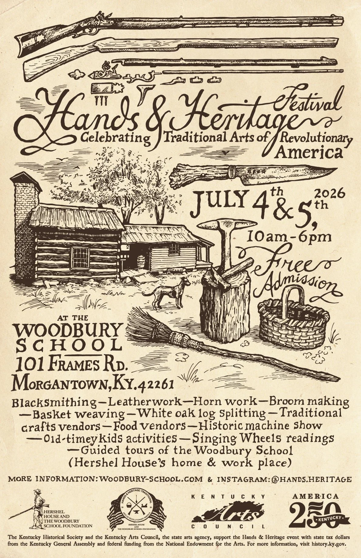 The weekend will celebrate the 250th anniversary of our nation and Hershel’s birthday with hands-on demonstrations, artisan workshops, colonial era crafts, and a guided tour of Hershel’s original cabins and blacksmith shop. This event will take place at Hershel’s historic homeplace in Woodbury, Kentucky.